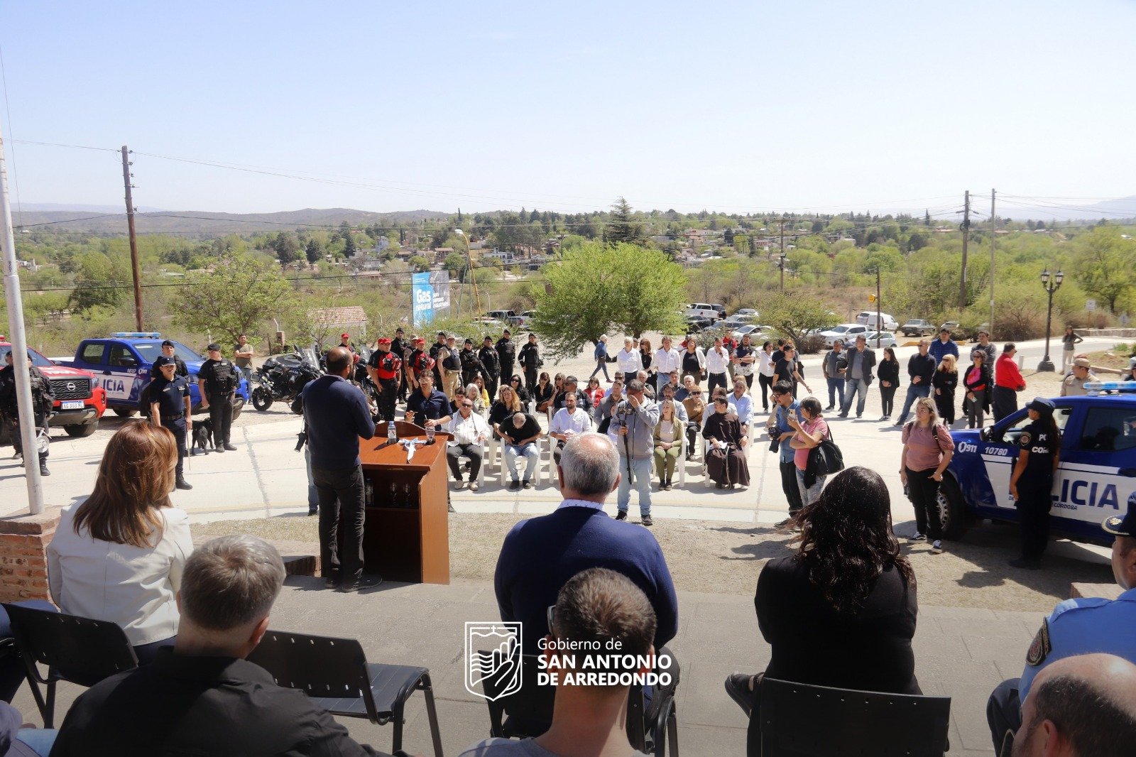 El Intendente Moyano, encargado de abrir el acto, destacó tres momentos clave de la jornada. En primer lugar, señaló la coincidencia con el natalicio del Papa Francisco, resaltando la importancia del “cuidado de la casa común y de la vida humana”, en colaboración con las fuerzas policiales. Además, recordó que un 3 de octubre, en un hito histórico para la localidad, se celebró la primera elección democrática en San Antonio de Arredondo, en la que fue elegido Humberto Buonanate, señalando que este evento refleja el compromiso cívico de la comunidad, más allá de las diferencias políticas. Finalmente, destacó su relación cercana con la Vicegobernadora, expresando la alegría de recibirla como una amiga que siempre ha estado presente para la localidad.